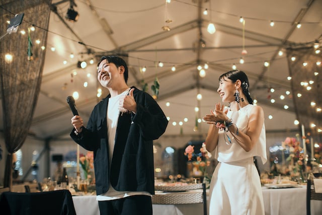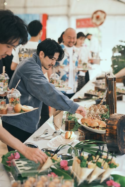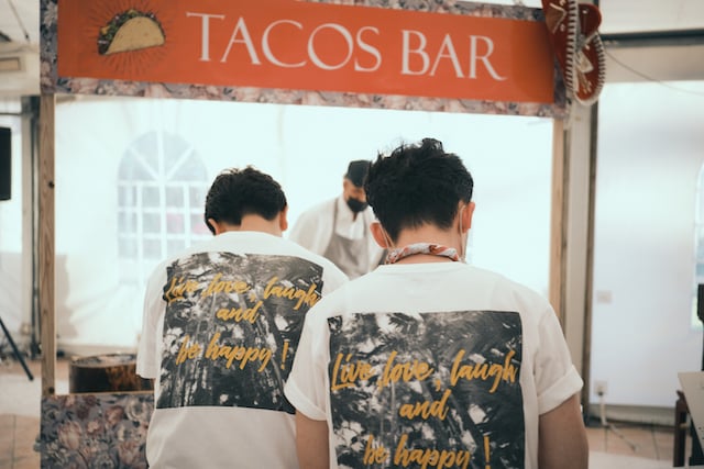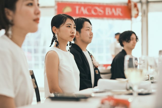 街中や岩場が印象的な海岸での周辺撮影、セレモニーの結びに退場は行わずにビールで乾杯、パーティではオリジナルのタコスを作りコンテストを行うなど、日差しが明るい時間から夜が更けるまで笑い声が途切れることがない一日でした。