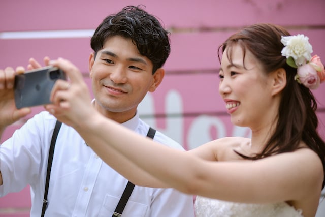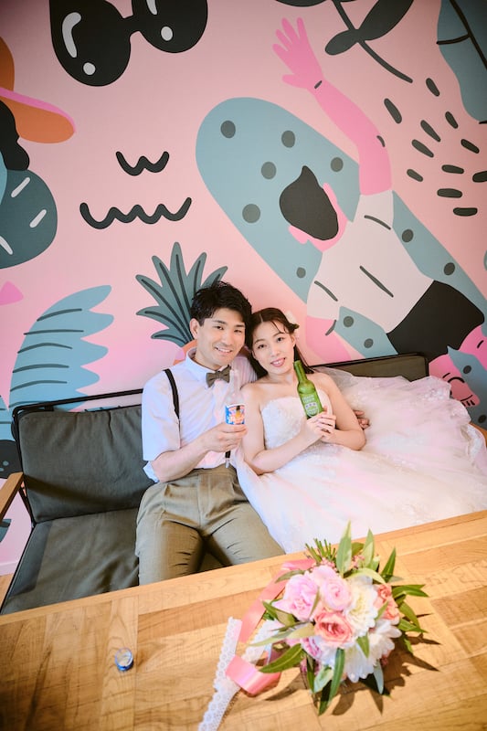 ご友人皆様のご自宅へ事前に新郎新婦様と同じドリンクをお届けし、撮影の合間に乾杯を行う。新婦様とご友人(高校時代の後輩)は