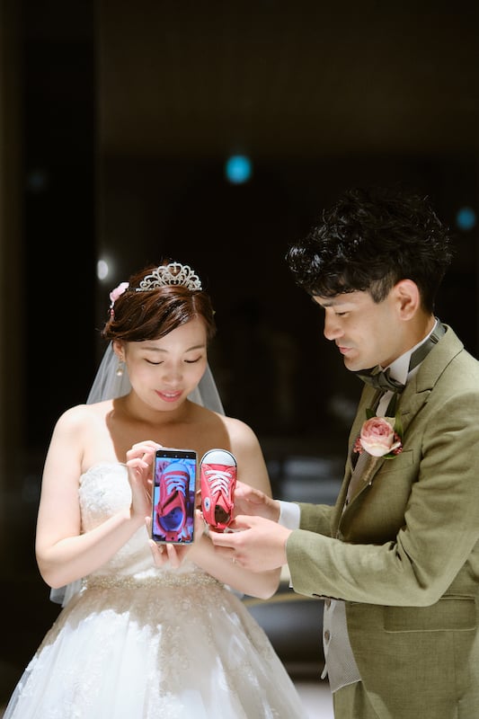 同じ時期にご懐妊されてお腹に赤ちゃんがいる為、また改めてお子様達とご一緒に沖縄の地に足を踏み出してほしいと願い、お互いのご夫婦へベビーシューズをサプライズでプレゼントする。