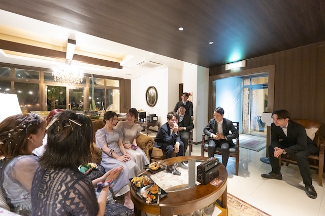 夕日も傾いたパーティ中、お酒を片手にラウンジでカセットテープに吹き込まれた新郎新婦の声に耳を傾けます・・・。
